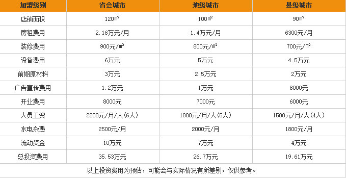 从上面的表格中我们能看到卷翻天酸辣粉加盟费的情况,省会城市卷翻天酸辣粉的加盟费用为35万元左右,地级城市卷翻天酸辣粉加盟费为26万元左右,而县级城市卷翻天酸辣粉的加盟费为19万元左右。