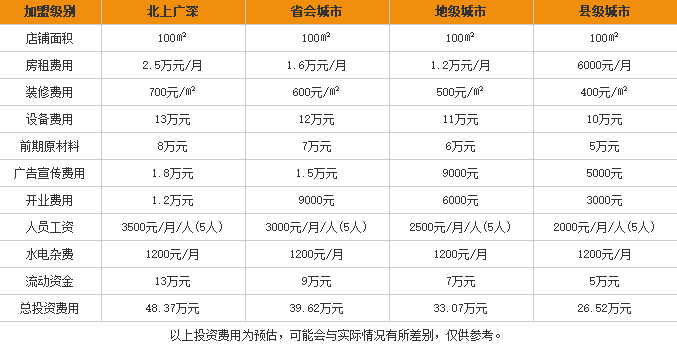从上面的表格中我们能看到梁小担牛肉粉加盟费的情况,省会城市梁小担牛肉粉的加盟费用为39万元左右,地级城市梁小担牛肉粉加盟费为33万元左右,而县级城市梁小担牛肉粉的加盟费为26万元左右。