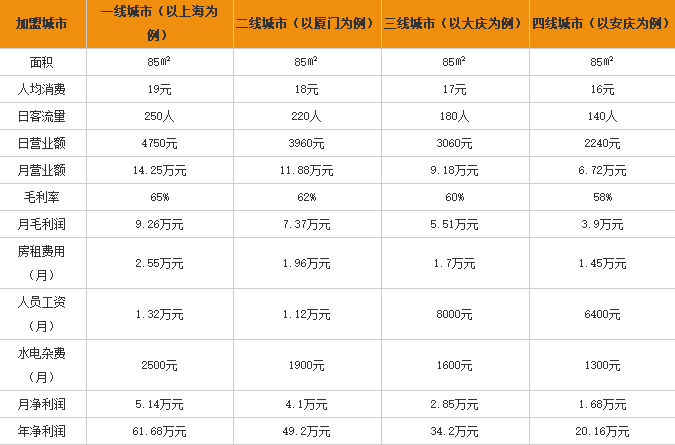 通过上表可以知道,一线城市纳西风情米线加盟店一个月能有5万元左右的净收入。二线城市纳西风情米线加盟店一个月能有4万元左右的净收入。三线城市纳西风情米线加盟店一个月能有2.8万元左右的净收入。