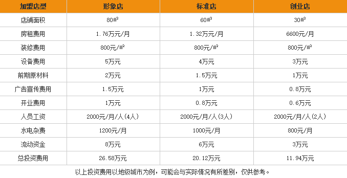 从上面的表格中我们能看到飘香源米粉加盟费的情况,飘香源米粉形象店的加盟费用为26万元左右,飘香源米粉标准店加盟费为20万元左右,而飘香源米粉创业店的加盟费为11万元左右。